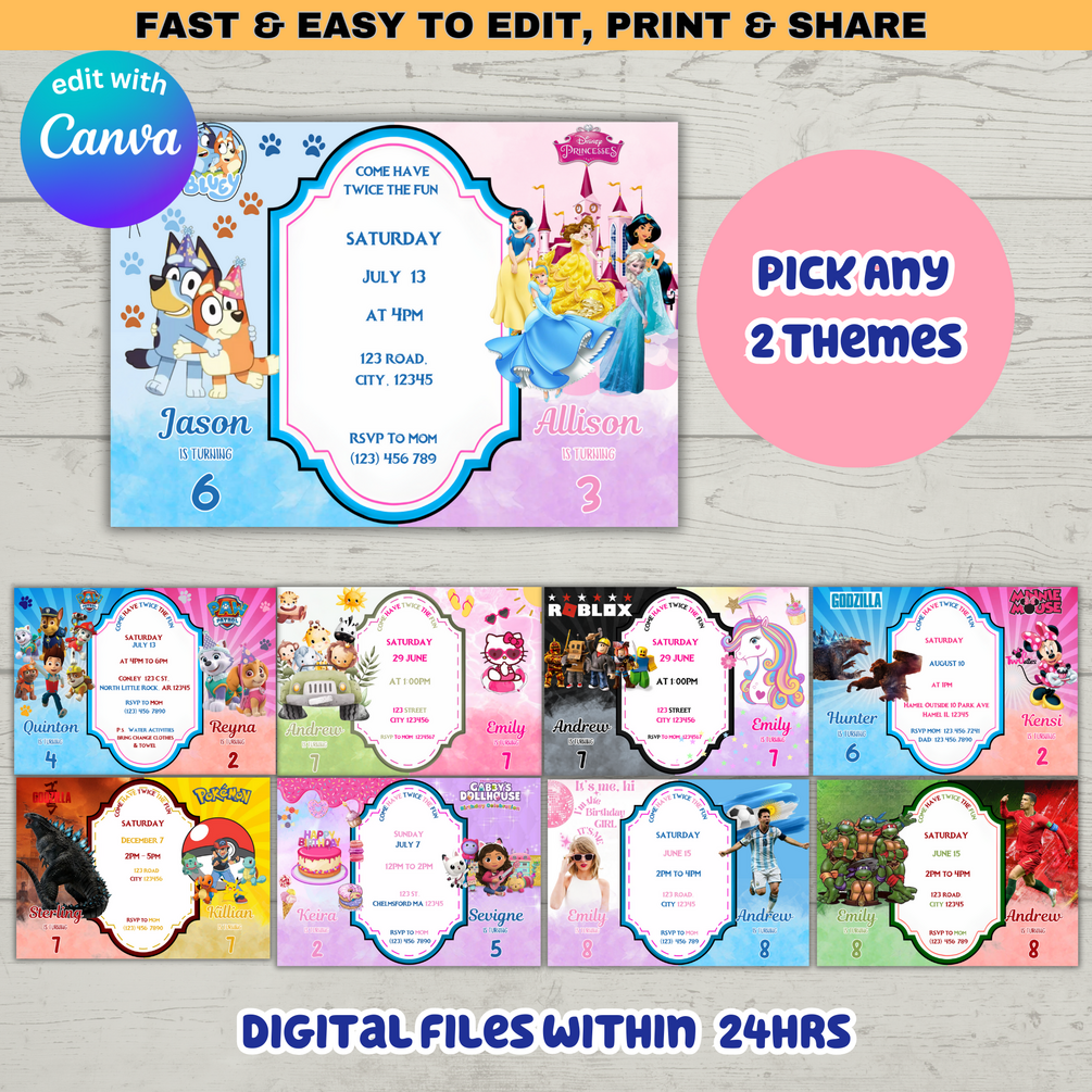 2. Provide the Details: After your purchase, you'll provide me with the necessary details, including the names, ages, party date, and the two themes you’ve chosen for each child.